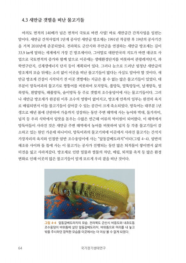 64 국가장기생태연구 4.3 새만금 갯벌을 떠난 물고기들 여의도 면적의 140배가 넘은 면적이 국토로 바뀐 사업! 바로 새만금간 간척사업을 일컫는 말이다. 새만금 간척사업의 1단계 공사인 새만금 방조제는 1991년 착공한 후 19년의 공사기간 을 거쳐 2010년에 준공되었다. 전라북도 군산시와 부안군을 연결하는 새만금 방조제는 길이 33.9 ㎞에 달하는 세계에서 가장 긴 방조제이다. 그야말로 대한민국의 지도가 바뀐 대규모 사 업으로 국토면적의 증가와 함께 앞으로 이곳에는 생태환경단지를 비롯하여 관광레저단지, 과 학연구단지, 신재생에너지 단지 등이 계획되어 있다. 그러나 눈으로 드러난 엄청난 새만금의 방조제의 모습 뒤에는 소리 없이 이곳을 떠난 물고기들이 많다는 사실도 알아야 할 것이다. 새 만금 방조제 건설...