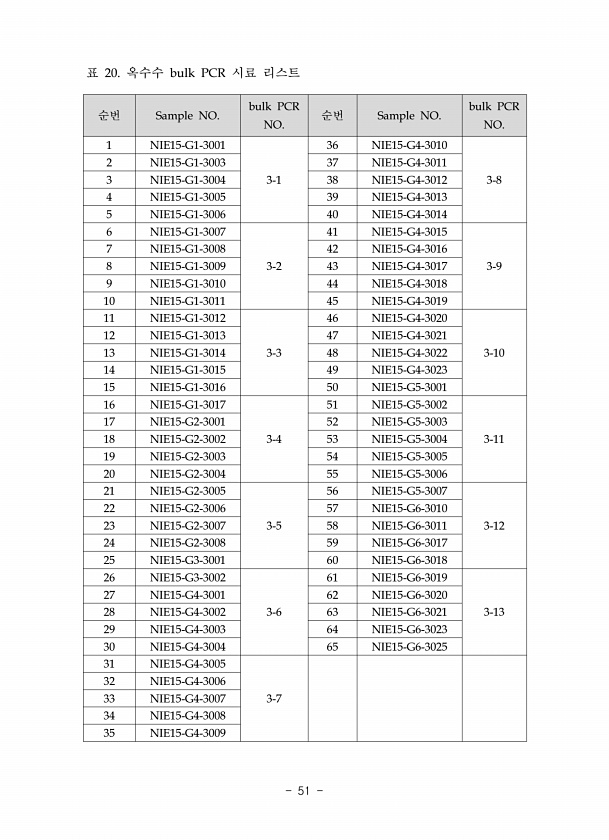순번 Sample NO. bulk PCR NO. 순번 Sample NO. bulk PCR NO. 1 NIE15-G1-3001 3-1 36 NIE15-G4-3010 3-8 2 NIE15-G1-3003 37 NIE15-G4-3011 3 NIE15-G1-3004 38 NIE15-G4-3012 4 NIE15-G1-3005 39 NIE15-G4-3013 5 NIE15-G1-3006 40 NIE15-G4-3014 6 NIE15-G1-3007 3-2 41 NIE15-G4-3015 3-9 7 NIE15-G1-3008 42 NIE15-G4-3016 8 NIE15-G1-3009 43 NIE15-G4-3017 9 NIE15-G1-3010 44 NIE15-G4-3018 10 NIE15-G1-3011 45 NIE15-G4-3019...