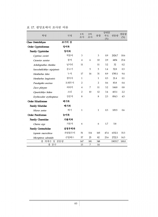 40 학명 국명 1차 조사 2차 조사 총합 상대풍 부도 % 생물량 생물량 % Class Osteichthyes 조기어 강 Order Cypriniformes 잉어목 Family Cyprinidae 잉어과 Cyprinus cuvieri 떡붕어 3 3 0.9 2024.7 10.6 Carassius auratus 붕어 4 6 10 2.9 4454 23.4 Acheilognathus rhombea 납지리 11 11 3.2 32 0.2 Sarcocheilichthys nigripinnis 중고기 5 5 1.4 52.8 0.3 Hemibarbus labeo 누치 17 14 31 8.9 1785.1 9.4 Hemibarbus longirostris 참마자 1 1 0.3 21.4 0.1 Pseudogobio esocinu...