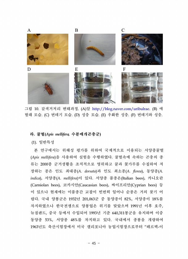 그림 10. 갈색거저리 변태과정. A 알 http//blog.naver.com/uribulrae. B 애 벌래 모습. C 번데기 모습. D 성충 모습. E 우화한 성충. F 번데기와 성충. 라. 꿀벌 Apis mellifera, 수분매개곤충군 1 일반특성 본 연구에서는 위해성 평가를 위하여 국제적으로 이용되는 서양종꿀벌 Apis mellifera 을 사용하여 실험을 수행하였다. 꿀벌속에 속하는 곤충의 종 류는 2000종 군거생활을 조직적으로 영위하고 꿀과 꽃가루를 수집하여 저 장하는 종은 인도 최대종 A. dorsata 과 인도 최소종 A. florea , 동양종 A. indica , 서양종 A. mellifera 이 있다. 서양종 품종은 Italian bees , 카니오란 Carniolan bees , 코...