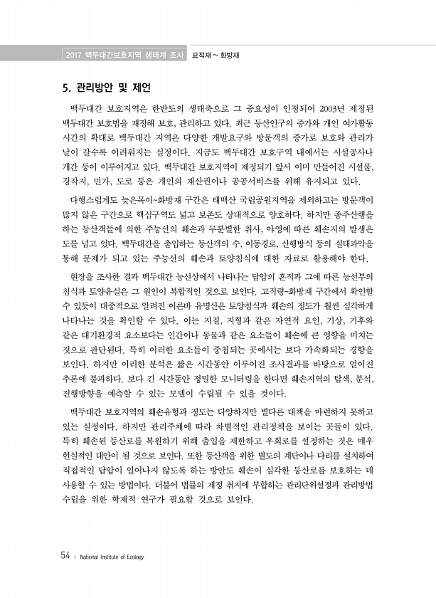 2017 백두대간보호지역 생태계 조사 묘적재 화방재 54 ? National Institute of Ecology 5. 관리방안 및 제언 백두대간 보호지역은 한반도의 생태축으로 그 중요성이 인정되어 2003년 제정된 백두대간 보호법을 재정해 보호, 관리하고 있다. 최근 등산인구의 증가와 개인 여가활동 시간의 확대로 백두대간 지역은 다양한 개발요구와 방문객의 증가로 보호와 관리가 날이 갈수록 어려워지는 실정이다. 지금도 백두대간 보호구역 내에서는 시설공사나 개간 등이 이루어지고 있다. 백두대간 보호지역이 제정되기 앞서 이미 만들어진 시설물, 경작지, 민가, 도로 등은 개인의 재산권이나 공공서비스를 위해 유지되고 있다. 다행스럽게도 늦은목이화방재 구간은 태백산 국립공원지역을 제외하고는 방문객이 많지 않은 구간으...