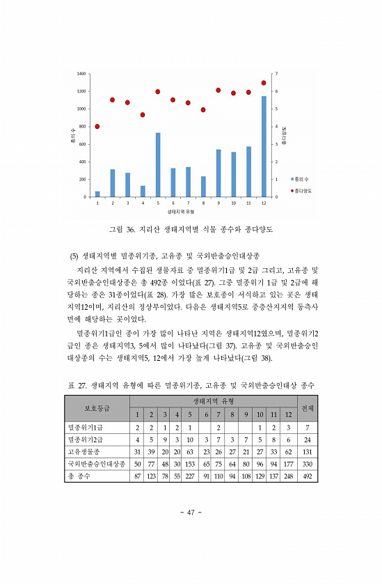 47 그림 36. 지리산 생태지역별 식물 종수와 종다양도 5 생태지역별 멸종위기종, 고유종 및 국외반출승인대상종 지리산 지역에서 수집된 생물자료 중 멸종위기1급 및 2급 그리고, 고유종 및 국외반출승인대상종은 총 492종 이었다 표 27 그중 멸종위기 1급 및 2급에 해 당하는 종은 31종이었다 표 28 가장 많은 보호종이 서식하고 있는 곳은 생태 지역12이며, 지리산의 정상부이었다. 다음은 생태지역5로 중층산지지역 동측사 면에 해당하는 곳이었다. 멸종위기1급인 종이 가장 많이 나타난 지역은 생태지역12였으며, 멸종위기2 급인 종은 생태지역3, 5에서 많이 나타났다 그림 37 고유종 및 국외반출승인 대상종의 수는 생태지역5, 12에서 가장 높게 나타났다 그림 38 보호등급 생태지역 유형 전체 1 2 3 4 ...