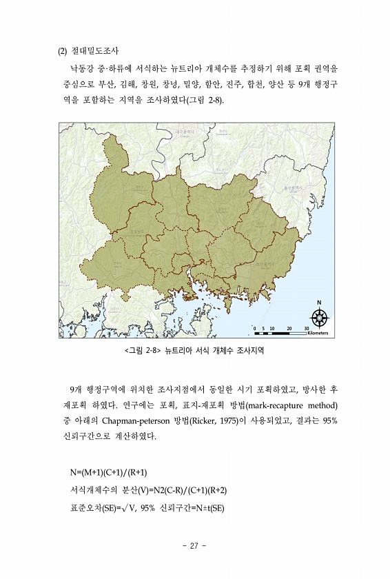 2 절대밀도조사 낙동강 중·하류에 서식하는 뉴트리아 개체수를 추정하기 위해 포획 권역을 중심으로 부산, 김해, 창원, 창녕, 밀양, 함안, 진주, 합천, 양산 등 9개 행정구 역을 포함하는 지역을 조사하였다 그림 2-8 ? ? ?? ? 9개 행정구역에 위치한 조사지점에서 동일한 시기 포획하였고, 방사한 후 재포획 하였다. 연구에는 포획, 표지-재포획 방법 mark-recapture method 중 아래의 Chapman-peterson 방법 Ricker, 1975 이 사용되었고, 결과는 95% 신뢰구간으로 계산하였다. N= M+1 C+1 R+1 서식개체수의 분산 V =N2 C-R C+1 R+2 표준오차 SE =√V, 95% 신뢰구간=N±t SE