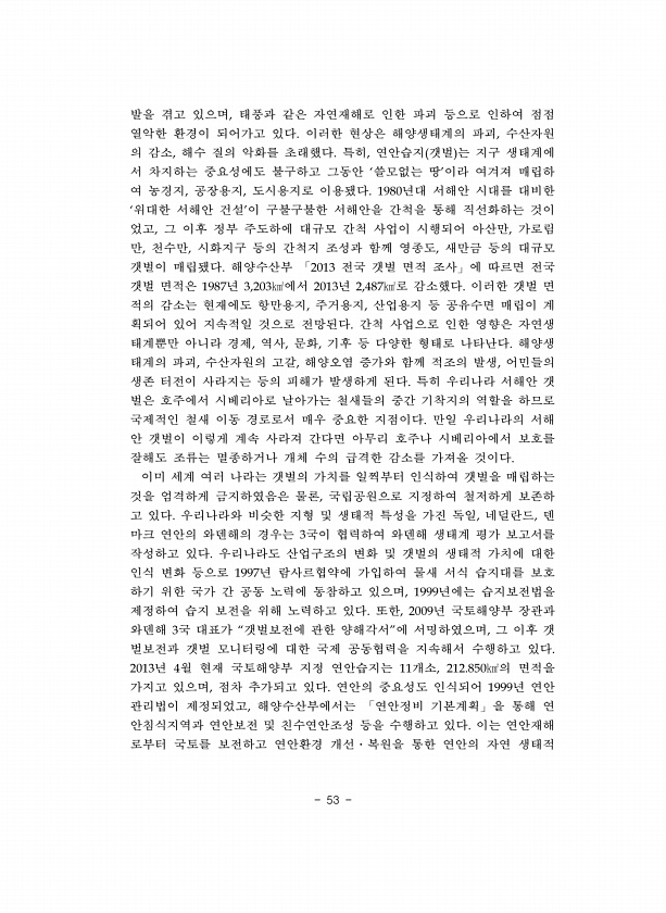 53 발을 겪고 있으며 태풍과 같은 자연재해로 인한 파괴 등으로 인하여 점점 열악한 환경이 되어가고 있다 이러한 현상은 해양생태계의 파괴 수산자원 의 감소 해수 질의 악화를 초래했다 특히 연안습지 갯벌 는 지구 생태계에 서 차지하는 중요성에도 불구하고 그동안 쓸모없는 땅 이라 여겨져 매립하 여 농경지 공장용지 도시용지로 이용됐다 년대 서해안 시대를 대비한 위대한 서해안 건설 이 구불구불한 서해안을 간척을 통해 직선화하는 것이 었고 그 이후 정부 주도하에 대규모 간척 사업이 시행되어 아산만 가로림 만 천수만 시화지구 등의 간척지 조성과 함께 영종도 새만금 등의 대규모 갯벌이 매립됐다 해양수산부 전국 갯벌 면적 조사 에 따르면 전국 갯벌 면적은 년 에서 년 로 감소했다 이러한 갯벌 면 적의 감소는 현재에도 항만...