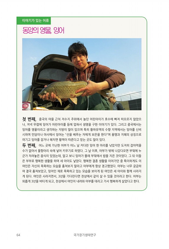 64 국가장기생태연구 이야기가 있는 어류 첫 번째, 중국의 마을 근처 저수지 주위에서 놀던 어린아이가 호수에 빠져 떠오르지 않았으 나, 저녁 무렵에 잉어가 어린아이를 등에 업혀서 생명을 구한 이야기가 있다. 그리고 중국에서는 잉어를 영물이라고 생각하는 지방이 많이 있으며 특히 황하유역의 수향 지역에서는 잉어를 신비 시하며 민담이나 야사에서 잉어는 선을 베푸는 자에게 보은을 한다며 용맹과 지혜의 상징으로 여기고 잉어를 잡거나 해치면 횡액이 따른다고 믿는 곳도 많이 있다. 두 번째, 어느 곳에 가난한 어부가 어느 날 커다란 잉어 한 마리를 낚았지만 도저히 잡아먹을 수가 없어서 물항아리 속에 넣어 키우기로 하였다. 그 날 이후, 어부가 밖에 나갔다오면 부엌에 누 군가 차려놓은 음식이 있었는데, 알고 보니 잉어가 ...
