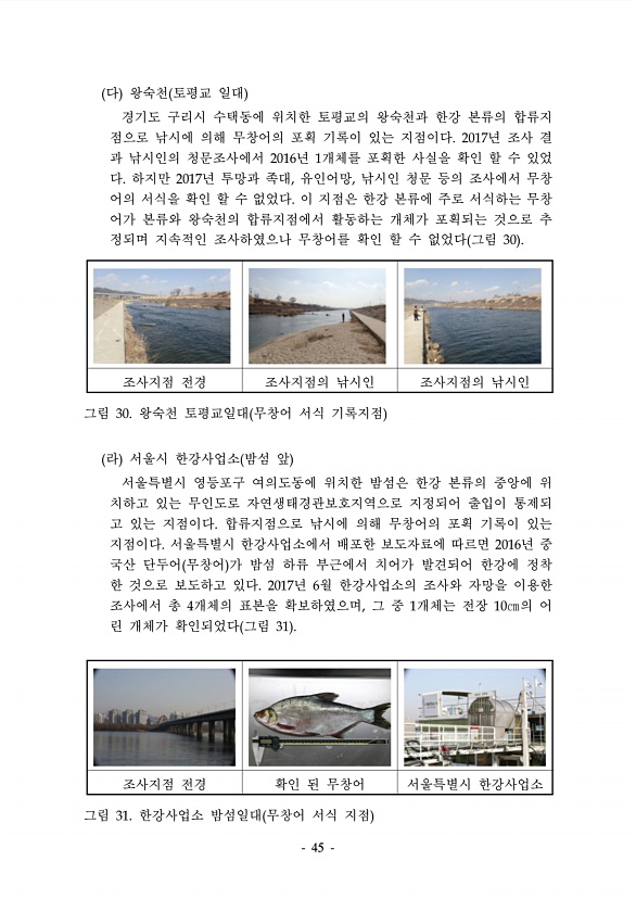 45 다 왕숙천 토평교 일대 경기도 구리시 수택동에 위치한 토평교의 왕숙천과 한강 본류의 합류지 점으로 낚시에 의해 무창어의 포획 기록이 있는 지점이다. 2017년 조사 결 과 낚시인의 청문조사에서 2016년 1개체를 포획한 사실을 확인 할 수 있었 다. 하지만 2017년 투망과 족대, 유인어망, 낚시인 청문 등의 조사에서 무창 어의 서식을 확인 할 수 없었다. 이 지점은 한강 본류에 주로 서식하는 무창 어가 본류와 왕숙천의 합류지점에서 활동하는 개체가 포획되는 것으로 추 정되며 지속적인 조사하였으나 무창어를 확인 할 수 없었다 그림 30 조사지점 전경 조사지점의 낚시인 조사지점의 낚시인 그림 30. 왕숙천 토평교일대 무창어 서식 기록지점 라 서울시 한강사업소 밤섬 앞 서울특별시 영등포구 여의도동에 위치한 ...