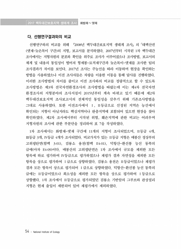 2017 백두대간보호지역 생태계 조사 화방재 댓재 54 ? National Institute of Ecology 다. 선행연구결과와의 비교 선행연구와의 비교를 위해 『2008년 백두대간보호지역 생태계 조사』의「태백산권 댓재늦은목이 구간 의 지형」보고서를 분석하였다. 2007년부터 시작된 1차 백두대간 조사에서는 지형자원의 분포와 확인을 위주로 조사가 이루어졌으나 조사방법, 보고서의 체계 및 내용의 통일성이 떨어져 형제봉묘적재구간과 늦은목이댓재를 조사한 팀의 조사결과가 차이를 보인다. 2017년 조사는 주능선을 따라 이동하며 현장을 확인하는 방법을 사용하였으나 이전 조사자들은 차량을 이용한 이동을 통해 답사를 진행하였다. 이러한 조사방법의 차이를 줄이고 이전 조사와의 비교를 정량적으로 할 수 있도록 조사방법은...