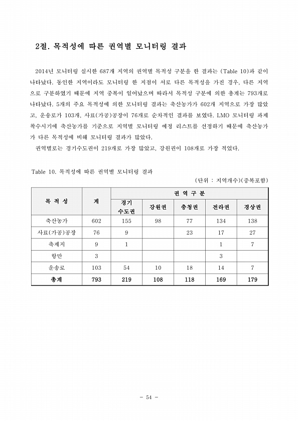 54 2절. 목적성에 따른 권역별 모니터링 결과 2014년 모니터링 실시한 687개 지역의 권역별 목적성 구분을 한 결과는 Table 10 과 같이 나타났다. 동인한 지역이라도 모니터링 한 지점이 서로 다른 목적성을 가진 경우, 다른 지역 으로 구분하였기 때문에 지역 중복이 일어났으며 따라서 목적성 구분에 의한 총계는 793개로 나타났다. 5개의 주요 목적성에 의한 모니터링 결과는 축산농가가 602개 지역으로 가장 많았 고, 운송로가 103개, 사료 가공 공장이 76개로 순차적인 결과를 보였다. LMO 모니터링 과제 착수시기에 축산농가를 기준으로 지역별 모니터링 예정 리스트를 선정하기 때문에 축산농가 가 다른 목적성에 비해 모니터링 결과가 많았다. 권역별로는 경기수도권이 219개로 가장 많았고, 강원권이 1...