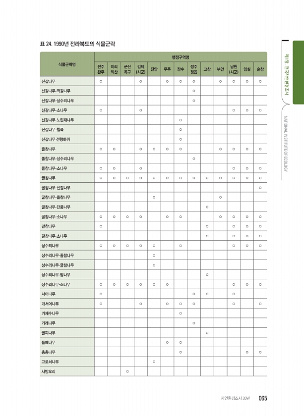 표 24. 1990년 전라북도의 식물군락 식물군락명 행정구역명 전주 완주 이리 익산 군산 옥구 김제 시군 진안 무주 장수 정주 정읍 고창 부안 남원 시군 임실 순창 신갈나무 ○ ○ ○ ○ ○ ○ ○ ○ ○ 신갈나무-떡갈나무 ○ 신갈나무-상수리나무 ○ 신갈나무-소나무 ○ ○ ○ ○ ○ 신갈나무-노린재나무 ○ 신갈나무-철쭉 ○ 신갈나무 전형하위 ○ 졸참나무 ○ ○ ○ ○ ○ ○ ○ ○ ○ ○ 졸참나무-상수리나무 ○ 졸참나무-소나무 ○ ○ ○ ○ ○ ○ 굴참나무 ○ ○ ○ ○ ○ ○ ○ ○ ○ ○ ○ ○ ○ 굴참나무-신갈나무 ○ 굴참나무-졸참나무 ○ ○ 굴참나무-단풍나무 ○ 굴참나무-소나무 ○ ○ ○ ○ ○ ○ ○ ○ ○ ○ 갈참나무 ○ ○ ○ ○ ○ 갈참나무-소나무 ○ ○ ○ ○ 상수리나무 ○ ○ ○ ○ ○ ○...