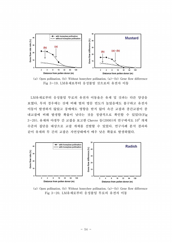 54 a Open pollination, b Without honeybee pollination, a b Gene flow difference Fig 3-19. LM유채로부터 웅성불임 갓으로의 유전자 이동 LM유채로부터 웅성불임 무로의 유전자 이동율은 유채 및 갓과는 다른 양상을 보였다. 무의 경우에는 갓에 비해 벌의 방문 빈도가 높았음에도 불구하고 유전자 이동이 발생하지 않았고 풍매에도 영향을 받지 않아 속간 교잡과 종간교잡이 종 내교잡에 비해 발생할 확률이 낮다는 것을 정량적으로 확인할 수 있었다 Fig 3-20 유채와 야생무 간 교잡을 보고한 Chevre 등 2000 의 연구에서도 106 개체 수준의 집단을 대상으로 교잡 개체를 선발할 수 있었다. 연구사례 분석 결과와 같이 유채와 무 간의 교잡은 자연...