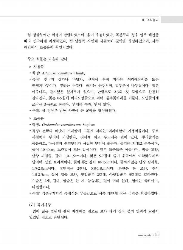 Ⅱ. 조사결과 www.nie.re.kr ? 55 섬 정상부에만 식생이 발달하였으며, 칡이 우점하였다. 목본류의 경우 일부 해안을 따라 빈약하게 자생하였다. 섬 남동쪽 사면에 사철쑥이 군락을 형성하였으며, 서쪽 해안에서 초종용이 확인되었다. 주요 식물은 다음과 같다. ◇ 사철쑥 ? 학명Artemisia capillaris Thunb. ? 특징전국의 강가나 바닷가, 산지에 흔히 자라는 여러해살이풀 또는 반떨기나무이다. 뿌리는 두껍다. 줄기는 곧추서며, 밑부분이 나무질이다. 잎은 마주나고, 줄기잎은 잎자루가 없으며, 난형으로 2-3회 깃 모양으로 완전히 갈라진다. 꽃은 8-9월에 머리모양꽃으로 피며, 원추꽃차례를 이룬다. 모인꽃싸개 조각은 34줄로 붙는다. 열매는 수과, 털이 없다. ? 주해섬 정상부 남동 사면에...