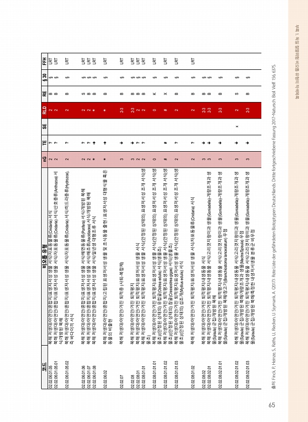 부록 1. 독일 절멸위험 비오톱 유형의 적색목록 출처Finck, P., Heinze, S., Raths, U., Riecken, U. Ssymank, A. 2017 Rote Liste der gef?hrdeten Biotoptypen Deutschlands. Dritte fortgeschriebene Fassung 2017.-Natursch. Biol. Vielf. 156, 637S. 코드 비오톱 유형 nG TE SE RLD RE § 30 FFH 02.02.06.01.05 북해 저생대/아연안/혼합지/표생저서성 생물 서식/자포동물류 Cnidaria 서식 2 ? 2 B § LRT 02.02.06.01.05.01 북해 저생대/아연안/혼합지/표생저서성 생물 서식/자포동물류 Cnidaria 서식/산호충류 Anthoz...