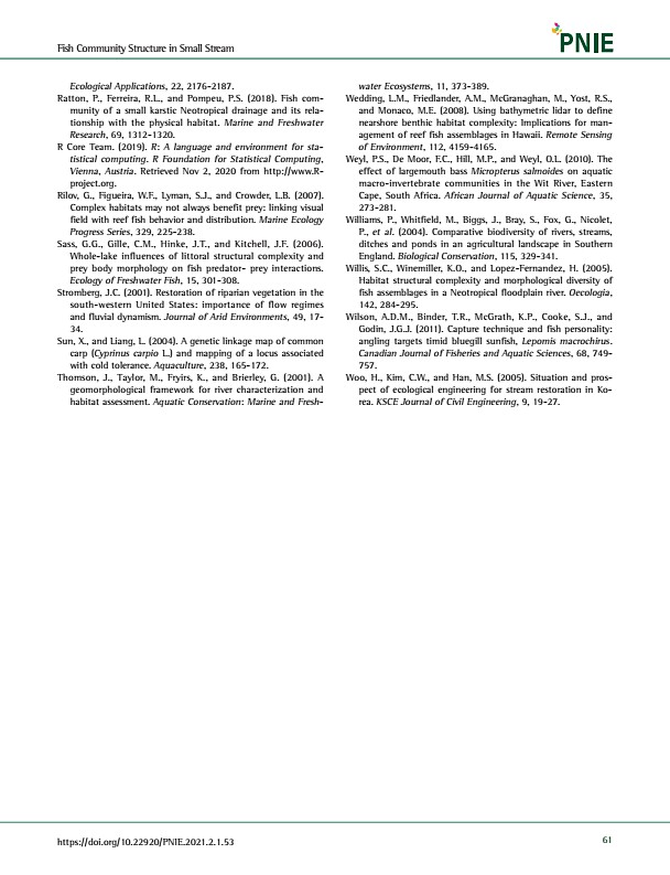 Fish Community Structure in Small Stream https//doi.org/10.22920/PNIE.2021.2.1.53 61 Ecological Applications, 22, 2176-2187. Ratton, P., Ferreira, R.L., and Pompeu, P.S. 2018 Fish community of a small karstic Neotropical drainage and its relationship with the physical habitat. Marine and Freshwater Research, 69, 1312-1320. R Core Team. 2019 RA language and environment for statistical computing. R ...