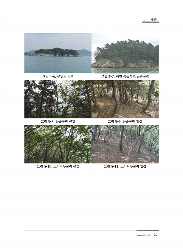 II. 조사결과 www.nie.re.kr ? 55 그림 3-6. 무인도 전경 그림 3-7. 해안 북동사면 곰솔군락 그림 3-8. 곰솔군락 근경 그림 3-9. 곰솔군락 임상 그림 3-10. 소사나무군락 근경 그림 3-11. 소사나무군락임상