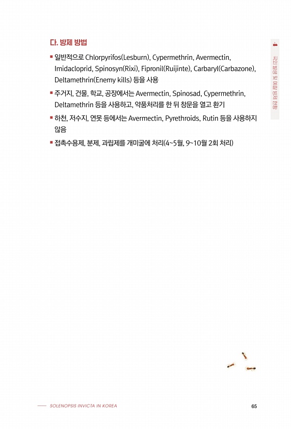 SOLENOPSIS INVICTA IN KOREA 65 4 국외 발생 및 예찰 방제 현황 다. 방제 방법 ■ 일반적으로 Chlorpyrifos Lesburn , Cypermethrin, Avermectin, Imidacloprid, Spinosyn Rixi , Fipronil Ruijinte , Carbaryl Carbazone , Deltamethrin Enemy kills 등을 사용 ■ 주거지, 건물, 학교, 공장에서는 Avermectin, Spinosad, Cypermethrin, Deltamethrin 등을 사용하고, 약품처리를 한 뒤 창문을 열고 환기 ■ 하천, 저수지, 연못 등에서는 Avermectin, Pyrethroids, Rutin 등을 사용하지 않음 ■ 접촉수용제, 분제, 과립제를 개미굴에...