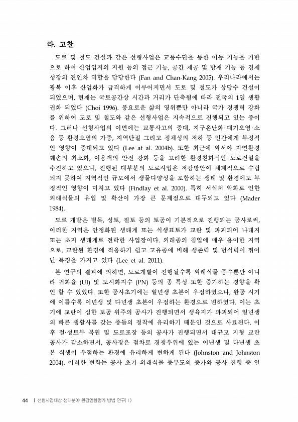 라 고찰 도로 및 철도 건설과 같은 선형사업은 교통수단을 통한 이동 기능을 기반 으로 하여 산업입지의 지원 등의 접근 기능 공간 제공 및 방재 기능 등 경제 성장의 견인차 역할을 담당한다 우리나라에서는 광복 이후 산업화가 급격하게 이루어지면서 도로 및 철도가 상당수 건설이 되었으며 현재는 국토공간상 시간과 거리가 단축됨에 따라 전국의 일 생활 권화 되었다 풍요로운 삶의 영위뿐만 아니라 국가 경쟁력 강화 를 위하여 도로 및 철도와 같은 선형사업은 지속적으로 진행되고 있는 중이 다 그러나 선형사업의 이면에는 교통사고의 증대 지구온난화 대기오염 소 음 등 환경오염의 가중 지역단절 그리고 정체성의 저하 등 인간에게 부정적 인 영향이 증대되고 있다 또한 최근에 와서야 자연환경 훼손의 최소화 이용객의 안전 강화 등을 ...
