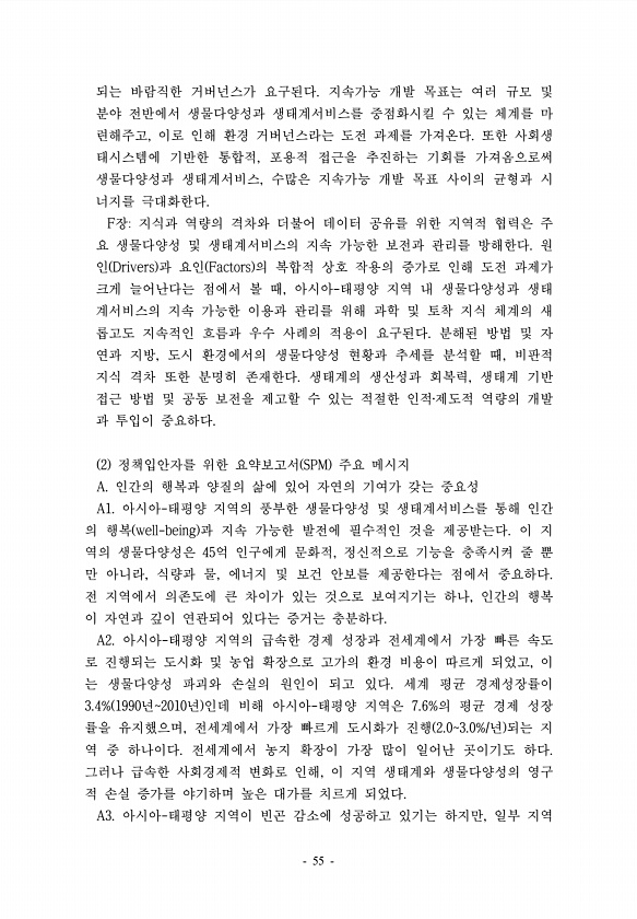 되는 바람직한 거버넌스가 요구된다. 지속가능 개발 목표는 여러 규모 및 분야 전반에서 생물다양성과 생태계서비스를 중점화시킬 수 있는 체계를 마 련해주고, 이로 인해 환경 거버넌스라는 도전 과제를 가져온다. 또한 사회생 태시스템에 기반한 통합적, 포용적 접근을 추진하는 기회를 가져옴으로써 생물다양성과 생태계서비스, 수많은 지속가능 개발 목표 사이의 균형과 시 너지를 극대화한다. F장지식과 역량의 격차와 더불어 데이터 공유를 위한 지역적 협력은 주 요 생물다양성 및 생태계서비스의 지속 가능한 보전과 관리를 방해한다. 원 인 Drivers 과 요인 Factors 의 복합적 상호 작용의 증가로 인해 도전 과제가 크게 늘어난다는 점에서 볼 때, 아시아-태평양 지역 내 생물다양성과 생태 계서비스의 지속 가능한 이용과 ...