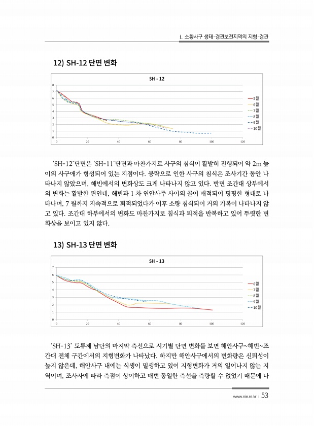 i. 소황사구 생태·경관보전지역의 지형·경관 www.nie.re.kr ? 53 12 SH-12 ‘SH-12’단면은 ‘SH-11’단면과 마찬가지로 사구의 침식이 활발히 진행되어 약 2m 높 이의 사구애가 형성되어 있는 지점이다. 붕락으로 인한 사구의 침식은 조사기간 동안 나 타나지 않았으며, 해빈에서의 변화상도 크게 나타나지 않고 있다. 반면 조간대 상부에서 의 변화는 활발한 편인데, 해빈과 1 차 연안사주 사이의 골이 매적되어 평평한 형태로 나 타나며, 7 월까지 지속적으로 퇴적되었다가 이후 소량 침식되어 거의 기복이 나타나지 않 고 있다. 조간대 하부에서의 변화도 마찬가지로 침식과 퇴적을 반복하고 있어 뚜렷한 변 화상을 보이고 있지 않다. 13 SH-13 ‘SH-13’ 도류제 남단의 마지막 측선으로 시기별...