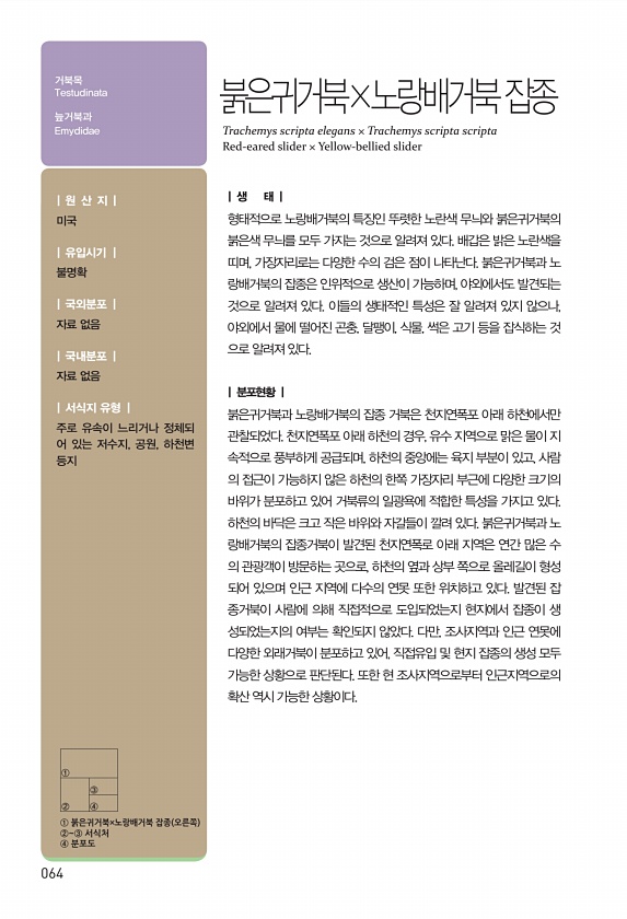 064 ① ② ③ ④ | 생 태 | 형태적으로 노랑배거북의 특징인 뚜렷한 노란색 무늬와 붉은귀거북의 붉은색 무늬를 모두 가지는 것으로 알려져 있다. 배갑은 밝은 노란색을 띠며, 가장자리로는 다양한 수의 검은 점이 나타난다. 붉은귀거북과 노 랑배거북의 잡종은 인위적으로 생산이 가능하며, 야외에서도 발견되는 것으로 알려져 있다. 이들의 생태적인 특성은 잘 알려져 있지 않으나, 야외에서 물에 떨어진 곤충, 달팽이, 식물, 썩은 고기 등을 잡식하는 것 으로 알려져 있다. | 분포현황 | 붉은귀거북과 노랑배거북의 잡종 거북은 천지연폭포 아래 하천에서만 관찰되었다. 천지연폭포 아래 하천의 경우, 유수 지역으로 맑은 물이 지 속적으로 풍부하게 공급되며, 하천의 중앙에는 육지 부분이 있고, 사람 의 접근이 가능하지 않은 ...