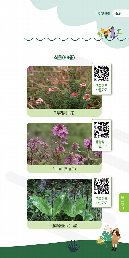 65 식물 88종 피뿌리풀 Ⅱ급 한라송이풀 Ⅱ급 한라옥잠난초 Ⅱ급 생물정보 바로가기 생물정보 바로가기 생물정보 바로가기 부 록5