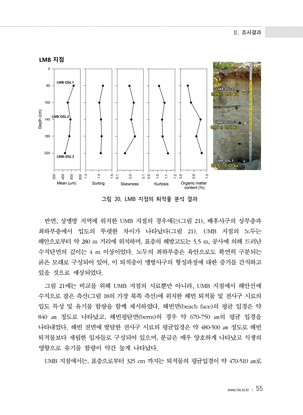 Ⅱ. 조사결과 www.nie.re.kr ? 55 그림 20. LMB 지점의 퇴적물 분석 결과 반면, 상맹방 지역에 위치한 UMB 지점의 경우에는 그림 21 , 배후사구의 상부층과 최하부층에서 입도의 뚜렷한 차이가 나타났다 그림 21 UMB 지점의 노두는 해안으로부터 약 280 m 거리에 위치하며, 표층의 해발고도는 5.5 m, 공사에 의해 드러난 수직단면의 깊이는 4 m 이상이었다. 노두의 최하부층은 육안으로도 확연히 구분되는 굵은 모래로 구성되어 있어, 이 퇴적층이 맹방사구의 형성과정에 대한 증거를 간직하고 있을 것으로 예상되었다. 그림 21에는 비교를 위해 UMB 지점의 시료뿐만 아니라, UMB 지점에서 해안선에 수직으로 잡은 측선 그림 18의 가장 북쪽 측선 에 위치한 해빈 퇴적물 및 전사구 시료의 입...