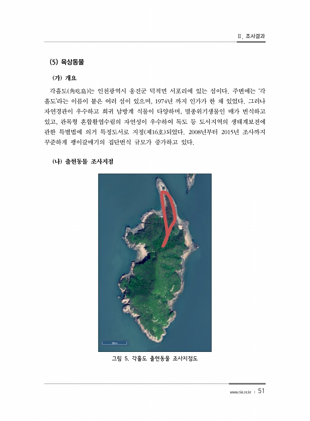 Ⅱ. 조사결과 www.nie.re.kr ? 51 5 육상동물 가 개요 각흘도 角吃島 는 인천광역시 옹진군 덕적면 서포리에 있는 섬이다. 주변에는 ‘각 흘도’라는 이름이 붙은 여러 섬이 있으며, 1974년 까지 인가가 한 채 있었다. 그러나 자연경관이 우수하고 희귀 남방계 식물이 다양하며, 멸종위기생물인 매가 번식하고 있고, 관목형 혼합활엽수림의 자연성이 우수하여 독도 등 도서지역의 생태계보전에 관한 특별법에 의거 특정도서로 지정 제16호 되었다. 2008년부터 2015년 조사까지 꾸준하게 괭이갈매기의 집단번식 규모가 증가하고 있다. 나 출현동물 조사지점 그림 5. 각흘도 출현동물조사지점도