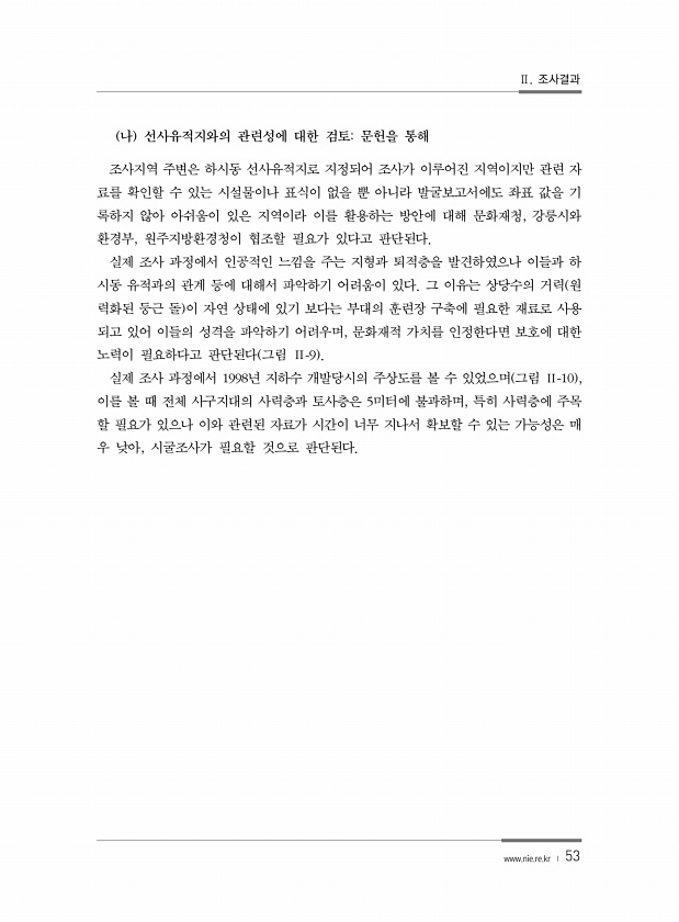 Ⅱ. 조사결과 www.nie.re.kr ? 53 나 선사유적지와의 관련성에 대한 검토문헌을 통해 조사지역 주변은 하시동 선사유적지로 지정되어 조사가 이루어진 지역이지만 관련 자 료를 확인할 수 있는 시설물이나 표식이 없을 뿐 아니라 발굴보고서에도 좌표 값을 기 록하지 않아 아쉬움이 있은 지역이라 이를 활용하는 방안에 대해 문화재청, 강릉시와 환경부, 원주지방환경청이 협조할 필요가 있다고 판단된다. 실제 조사 과정에서 인공적인 느낌을 주는 지형과 퇴적층을 발견하였으나 이들과 하 시동 유적과의 관계 등에 대해서 파악하기 어려움이 있다. 그 이유는 상당수의 거력 원 력화된 둥근 돌 이 자연 상태에 있기 보다는 부대의 훈련장 구축에 필요한 재료로 사용 되고 있어 이들의 성격을 파악하기 어려우며, 문화재적 가치를 인...