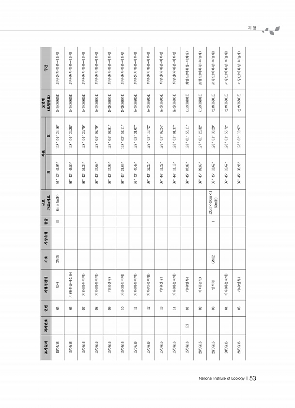 지 형 National Institute of EcologyⅠ53 조사일자 격자번호 연번 지형경관명 기호 사상유형 등급 규모 가로x세로 좌표 도엽명 N E 도엽번호 구간 15/07/16 05 토어 GM05 Ⅲ 6m×3m H 36° 42′ 41.95″ 128° 04′ 24.16″ 문경 368051 희양산 악휘봉이화령 15/07/16 06 기타 인공시설물 36° 42′ 49.50″ 128° 04′ 22.38″ 문경 368051 희양산 악휘봉이화령 15/07/16 07 기타 훼손지역 36° 42′ 54.24″ 128° 04′ 20.70″ 문경 368051 희양산 악휘봉이화령 15/07/16 08 기타 훼손지역 36° 43′ 17.68″ 128° 04′ 07.70″ 문경 368051 희양산 악휘봉이화령 15/07/...