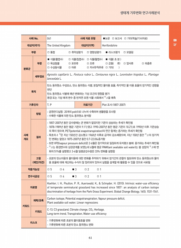 61 생태계 기후변화 연구사례분석 식 물 사례 No. 041 사례 자료 유형 ■논문 □ 보고서 □ 기타 학술/기사자료 대상지 국가 The United Kingdom 대상지 지역 Hertfordshire 부문 □ 통합 □ 취약성평가 □ 영향성평가 ■ 리스크평가 □ 모델링 분류군 부문 ■ 식물 활엽수 □ 식물 침엽수 □ 식물 활엽수 ■ 식물 초 본 □ 육상동물 □ 포유류 □ 조류 □ 곤충 류 □ 양서류 □ 파충류 □ 수상동식물 □ 어류 □ 저서무척추류 □ 기타 세부정보 Agrostis capillaris L., Festuca rubra L., Centaurea nigra L., Leontodon hispidus L., Plantago lanceolata L. 목적 탄소 동위원소 구성요소, 탄소 동위원소 식별, ...
