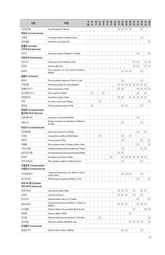 61 미치광이풀 Scopolia japonica Maxim. ○ ○ ○ ○ ○ 메꽃과 Convolvulaceae 선메꽃 Calystegia dahurica Herb. Choisy ○ 아욱메풀 Dichondra micrantha Urb. ○ 꿀풀목 Lamiales 지치과 Boraginaceae 갯지치 Mertensia asiatica Takeda J. F. Macbr. ○ ○ 마편초과 Verbenaceae 새비나무 Callicarpa mollis Siebold & Zucc. ○ ○ ○ ○ 마편초 Verbena offcalis L. ○ ○ ○ ○ 좀목형 Vitex negundo var. heterophylla Franch. Rehder ○ ○ ○ ○ 꿀풀과 Lamiaceae 용머리 Dracocephalum ar...