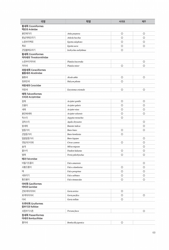 63 황새목 Ciconiiformes 백로과 Ardeidae 붉은왜가리 Ardea purpurea ○ ○ 흰날개해오라기 Ardeola bacchus ○ ○ 노랑부리백로 Egretta eulophotes ○ ○ 흑로 Egretta sacra ○ ○ 큰덤불해오라기 Ixobrychus eurhythmus ○ 황새목 Ciconiiformes 저어새과 Threskiornithidae 노랑부리저어새 Platalea leucorodia ○ 저어새 Platalea minor ○ ○ 파랑새목 Coraciiformes 물총새과 Alcedinidae 물총새 Alcedo atthis ○ ○ 청호반새 Halcyon pileata ○ 파랑새과 Coraciidae 파랑새 Eurystomus orientalis ○ ○ 매목 Falcon...