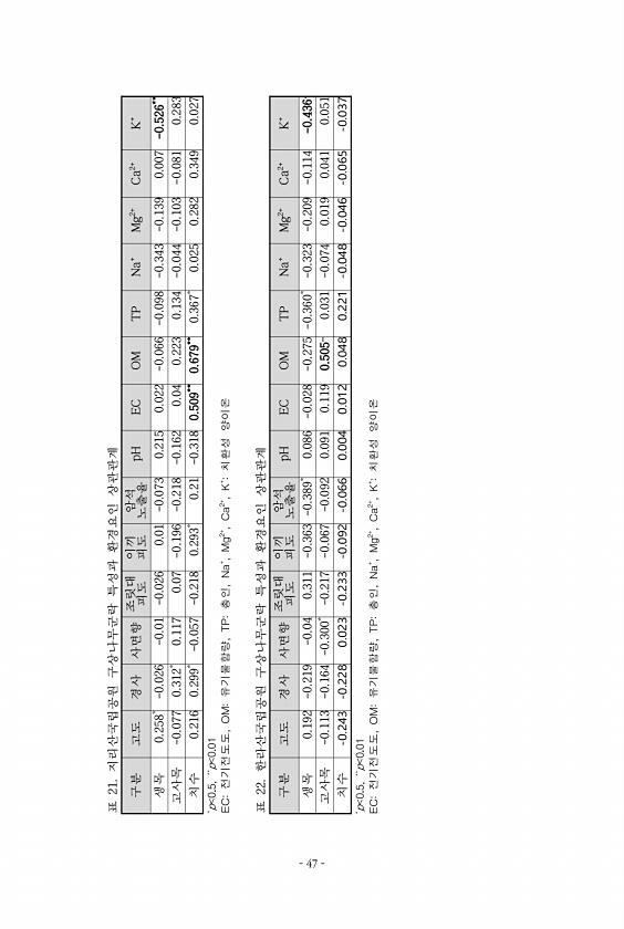 구분 고도 경사 사면향 조릿대 피도 이끼 피도 암석 노출율 pH EC OM TP Na+ Mg2+ Ca2+ K+ 생목 0.258* -0.026 -0.01 -0.026 0.01 -0.073 0.215 0.022 -0.066 -0.098 -0.343 -0.139 0.007 -0.526** 고사목 -0.077 0.312* 0.117 0.07 -0.196 -0.218 -0.162 0.04 0.223 0.134 -0.044 -0.103 -0.081 0.283 치수 0.216 0.299* -0.057 -0.218 0.293* 0.21 -0.318 0.509** 0.679** 0.367* 0.025 0.282 0.349 0.027 표 21. 지리산국립공원 구상나무군락 특성과 환경요인 상관관계 구분 고도 경사 사면향 조릿대...