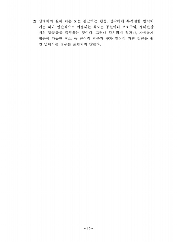 49 생태계의 실제 이용 또는 접근하는 행동 심각하게 부적절한 방식이 기는 하나 일반적으로 이용되는 척도는 공원이나 보호구역 생태관광 지의 방문율을 측정하는 것이다 그러나 감시되지 않거나 자유롭게 접근이 가능한 장소 등 공식적 방문자 수가 일상적 자연 접근을 훨 씬 넘어서는 경우는 포함되지 않는다 49