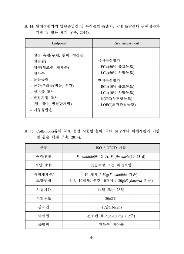 44 표 14. 위해성평가의 영향종말점 및 독성종말점 출처국내 토양생태 위해성평가 기반 및 활용 체계 구축, 2014 Endpoint Risk assessment 생장 측정 무게, 길이, 생장률, 생질량 계수 세포수, 개체수 생사수 운동능력 산란/부화율 비율, 시간 성비율 조사 발달과정 조사 알, 배아, 발달단계별 기형유발율 급성독성평가 EC50 50% 유효농도 LC50 50% 사망농도 만성독성평가 EC10 10% 유효농도 LC10 10% 사망농도 NOEC 무영향농도 LOEC 최저관찰농도 표 15. Collembola류의 국제 공인 시험법 출처국내 토양생태 위해성평가 기반 및 활용 체계 구축, 2014 구분 ISO OECD 기준 종명/연령 F. candida 912 d , F. fimetaria 1923 d...
