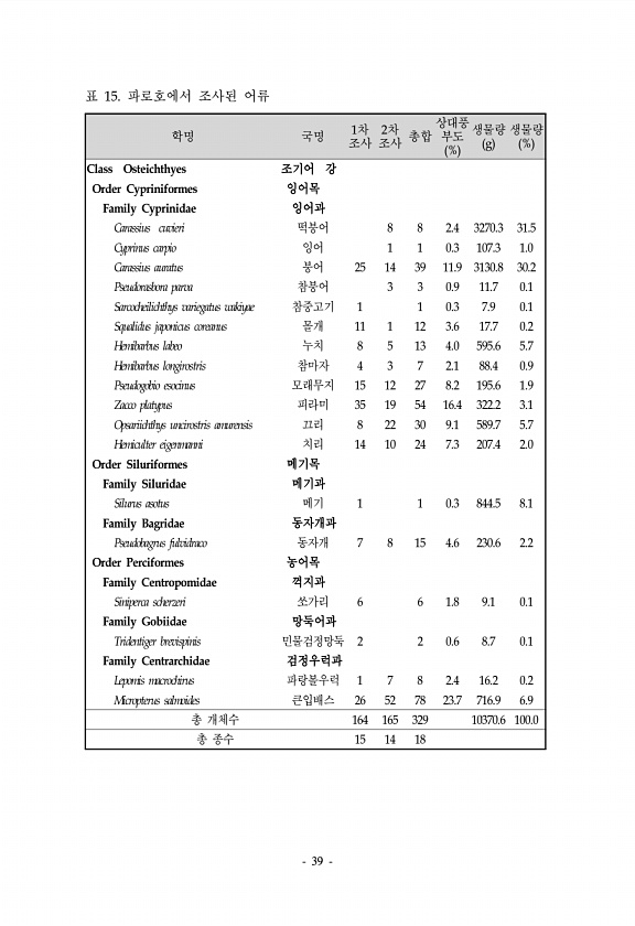 39 학명 국명 1차 조사 2차 조사 총합 상대풍 부도 % 생물량 g 생물량 % Class Osteichthyes 조기어 강 Order Cypriniformes 잉어목 Family Cyprinidae 잉어과 Carassius cuvieri 떡붕어 8 8 2.4 3270.3 31.5 Cyprinus carpio 잉어 1 1 0.3 107.3 1.0 Carassius auratus 붕어 25 14 39 11.9 3130.8 30.2 Pseudorasbora parva 참붕어 3 3 0.9 11.7 0.1 Sarcocheilichthys variegatus wakiyae 참중고기 1 1 0.3 7.9 0.1 Squalidus japonicus coreanus 몰개 11 1 12 3.6 17.7 0.2 Hemiba...