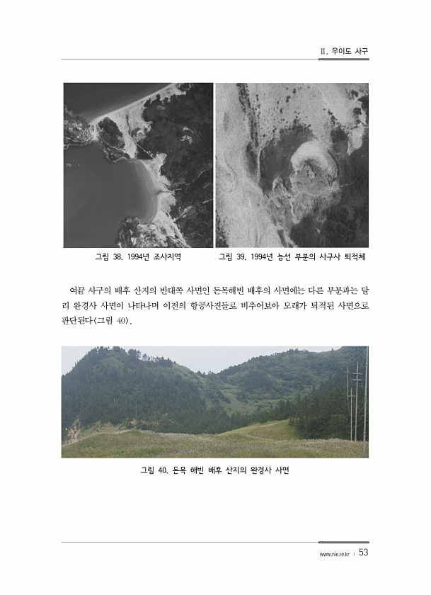 Ⅱ. 우이도 사구 www.nie.re.kr ? 53 그림 38. 1994년 조사지역 그림 39. 1994년 능선 부분의 사구사 퇴적체 여끝 사구의 배후 산지의 반대쪽 사면인 돈목해빈 배후의 사면에는 다른 부분과는 달 리 완경사 사면이 나타나며 이전의 항공사진들로 비추어보아 모래가 퇴적된 사면으로 판단된다 그림 40 그림 40. 돈목 해빈 배후 산지의 완경사사면