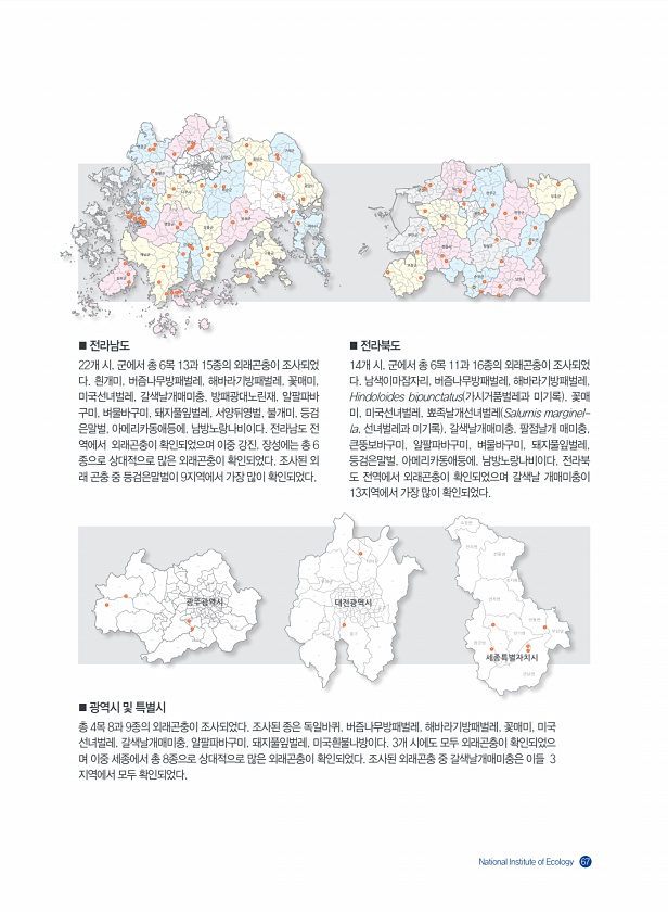 National Institute of Ecology 67 ■ 광역시 및 특별시 총 4목 8과 9종의 외래곤충이 조사되었다. 조사된 종은 독일바퀴, 버즘나무방패벌레, 해바라기방패벌레, 꽃매미, 미국 선녀벌레, 갈색날개매미충, 알팔파바구미, 돼지풀잎벌레, 미국흰불나방이다. 3개 시에도 모두 외래곤충이 확인되었으 며 이중 세종에서 총 8종으로 상대적으로 많은 외래곤충이 확인되었다. 조사된 외래곤충 중 갈색날개매미충은 이들 3 지역에서 모두 확인되었다. ■ 전라남도 22개 시, 군에서 총 6목 13과 15종의 외래곤충이 조사되었 다. 흰개미, 버즘나무방패벌레, 해바라기방패벌레, 꽃매미, 미국선녀벌레, 갈색날개매미충, 방패광대노린재, 알팔파바 구미, 벼물바구미, 돼지풀잎벌레, 서양뒤영벌, 불개미, 등검 은말벌, 아...