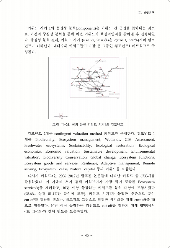 Ⅱ. 선행연구 45 키워드 시기 1의 응집성 분석 component 은 키워드 간 군집을 찾아내는 것으 로, 이전의 중심성 분석을 통해 어떤 키워드가 핵심적인지를 찾아낸 후 진행하였 다. 응집성 분석 결과, 키워드 시기1 size 27, 96.43% 은 2 size 1, 3.57% 개의 컴포 넌트가 나타난다. 대다수의 키워드들이 가장 큰 그룹인 컴포넌트1 네트워크로 구 성된다. 그림 Ⅱ 21. 국외 문헌 키워드 시기1의 컴포넌트 컴포넌트 2에는 contingent valuation method 키워드만 존재한다. 컴포넌트 1 에는 Biodiversity, Ecosystem management, Wetlands, GIS, Assessment, Freshwater ecosystems, Sustainability...
