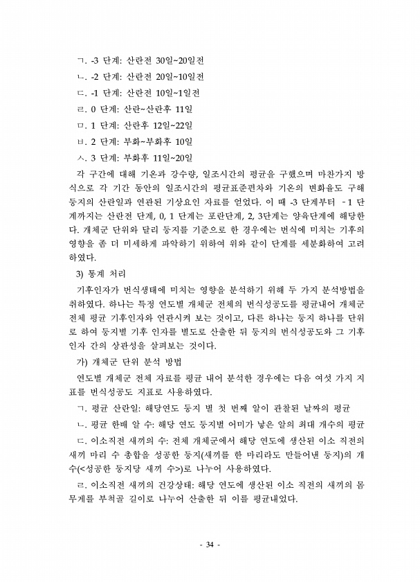 34 ㄱ. -3 단계산란전 30일20일전 ㄴ. -2 단계산란전 20일10일전 ㄷ. -1 단계산란전 10일1일전 ㄹ. 0 단계산란산란후 11일 ㅁ. 1 단계산란후 12일22일 ㅂ. 2 단계부화부화후 10일 ㅅ. 3 단계부화후 11일20일 각 구간에 대해 기온과 강수량, 일조시간의 평균을 구했으며 마찬가지 방 식으로 각 기간 동안의 일조시간의 평균표준편차와 기온의 변화율도 구해 둥지의 산란일과 연관된 기상요인 자료를 얻었다. 이 때 -3 단계부터 ?1 단 계까지는 산란전 단계, 0, 1 단계는 포란단계, 2, 3단계는 양육단계에 해당한 다. 개체군 단위와 달리 둥지를 기준으로 한 경우에는 번식에 미치는 기후의 영향을 좀 더 미세하게 파악하기 위하여 위와 같이 단계를 세분화하여 고려 하였다. 3 통계 처리 기후인...