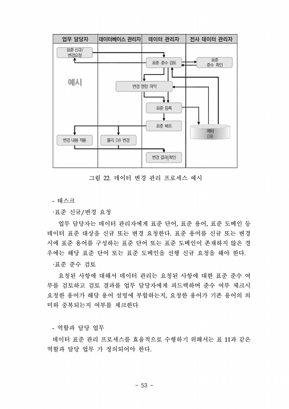 그림 22. 데이터 변경 관리 프로세스 예시 태스크 ·표준 신규/변경 요청 업무 담당자는 데이터 관리자에게 표준 단어, 표준 용어, 표준 도메인 등 데이터 표준 대상을 신규 또는 변경 요청한다. 표준 용어를 신규 또는 변경 시에 표준 용어를 구성하는 표준 단어 또는 표준 도메인이 존재하지 않은 경 우에는 해당 표준 단어 또는 표준 도메인을 선행 신규 요청을 해야 한다. ·표준 준수 검토 요청된 사항에 대해서 데이터 관리는 요청된 사항에 대한 표준 준수 여 부를 검토하고 검토 결과를 업무 담당자에게 피드백하며 준수 여부 체크시 요청한 용어가 해당 용어 설명에 부합하는지, 요청한 용어가 기존 용어의 의 미와 중복되는지 여부를 체크한다 역할과 담당 업무 데이터 표준 관리 프로세스를 효율적으로 수행하기 위해서는 표...