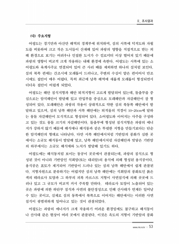 Ⅱ. 조사결과 www.nie.re.kr ? 53 다 주요지형 어평도는 경기만과 아산만 해역의 경계부에 위치하며, 섬의 서쪽에 덕적도와 자월 도를 비롯하여 크고 작은 도서들이 산재해 있어 파랑의 영향을 직접적으로 받는 외 해 환경으로 보기는 어려우나 인접한 도서가 수 킬로미터 이상 떨어져 있기 때문에 파랑의 영향이 비교적 크게 작용하는 내해 환경에 속한다. 어평도는 서쪽에 있는 소 어평도와 육계사주로 연결되어 있어 큰 사리 때를 제외하면 하나의 섬처럼 보인다. 섬의 북쪽 편에는 간조시에 모래톱이 드러나고, 주변의 수심이 얕은 편이어서 만조 시에도 접안이 매우 어렵다. 특히 최근에 남쪽 해역에 새롭게 모래톱이 형성되면서 더더욱 접안이 어렵게 되었다. 어평도는 해안 침식지형과 해안 퇴적지형이 고르게 발달되어 있는...