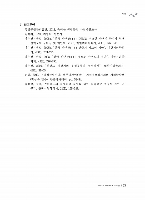 지 형 National Institute of EcologyⅠ53 7. 참고문헌 국립공원관리공단, 2011, 속리산 국립공원 자연자원조사. 권혁재, 1999, 지형학, 법문사. 박수진ㆍ손일, 2005a, 한국 산맥론 Ⅰ DEM을 이용한 산맥의 확인과 현행 산맥도의 문제점 및 대안의 모색, 대한지리학회지, 40 1 , 126-152. 박수진ㆍ손일, 2005b, 한국 산맥론 Ⅱ 산줄기 지도의 제안, 대한지리학회 지, 40 2 , 253-273. 박수진ㆍ손일, 2008, 한국 산맥론 Ⅲ 새로운 산맥도의 제안, 대한지리학 회지, 43 3 , 276-295. 박수진, 2009, 한반도 평탄지의 유형분류와 형성과정, 대한지리학회지, 44 1 , 31-55. 손일, 2002, “태백산맥이냐, 백두대간이냐?” , 지식정보...