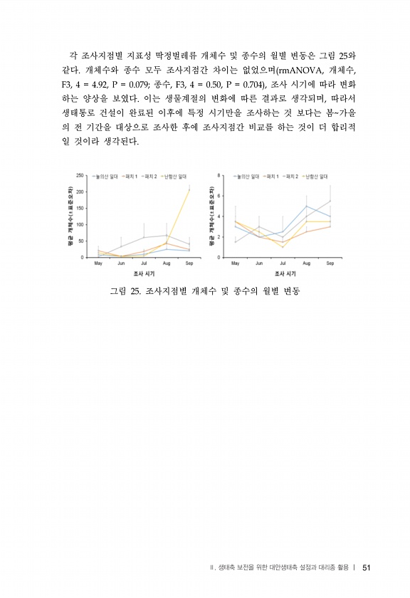 51 각 조사지점별 지표성 딱정벌레류 개체수 및 종수의 월별 변동은 그림 와 같다 개체수와 종수 모두 조사지점간 차이는 없었으며 개체수 종수 조사 시기에 따라 변화 하는 양상을 보였다 이는 생물계절의 변화에 따른 결과로 생각되며 따라서 생태통로 건설이 완료된 이후에 특정 시기만을 조사하는 것 보다는 봄 가을 의 전 기간을 대상으로 조사한 후에 조사지점간 비교를 하는 것이 더 합리적 일 것이라 생각된다 그림 조사지점별 개체수 및 종수의 월별 변동 Ⅱ. 생태축 보전을 위한 대안생태축 설정과 대리종 활용 |51