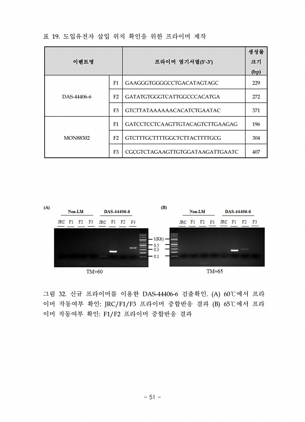 표 19. 도입유전자 삽입 위치 확인을 위한 프라이머 제작 이벤트명 프라이머 염기서열 5-3생성물 크기 bp DAS-44406-6 F1 GAAGGGTGGGGCCTGACATAGTAGC 229 F2 GATATGTGGGTCATTGGCCCACATGA 272 F3 GTCTTATAAAAAACACATCTGAATAC 371 MON88302 F1 GATCCTCCTCAAGTTGTACAGTCTTGAAGAG 196 F2 GTCTTTGCTTTTGGCTCTTACTTTTGCG 304 F3 CGCGTCTAGAAGTTGTGGATAAGATTGAATC 407 그림 32. 신규 프라이머를 이용한 DAS-44406-6 검출확인. A 60℃에서 프라 이머 작동여부 확인JRC/F1/F3 프라이머 중합반응 결과 B 65℃에서 프라 이머 작동여부 확인...