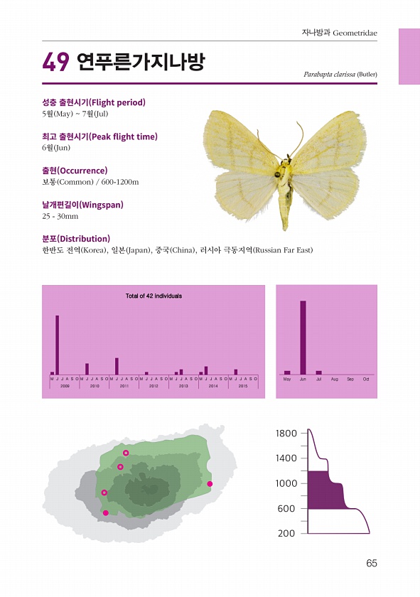 65 자나방과 Geometridae 성충 출현시기 Flight period 5월 May 7월 Jul 최고 출현시기 Peak fight time 6월 Jun 출현 Occurrence 보통 Common 600-1200m 날개편길이 Wingspan 25 30mm 분포 Distribution 한반도 전역 Korea , 일본 Japan , 중국 China , 러시아 극동지역 Russian Far East Parabapta clarissa Butler M J J A S O M J J A S O M J J A S O M J J A S O M J J A S O M J J A S O M J J A S O May Jun Jul Aug Sep Oct 2009 2010 2011 2012 2013 2014 2015 Total of...