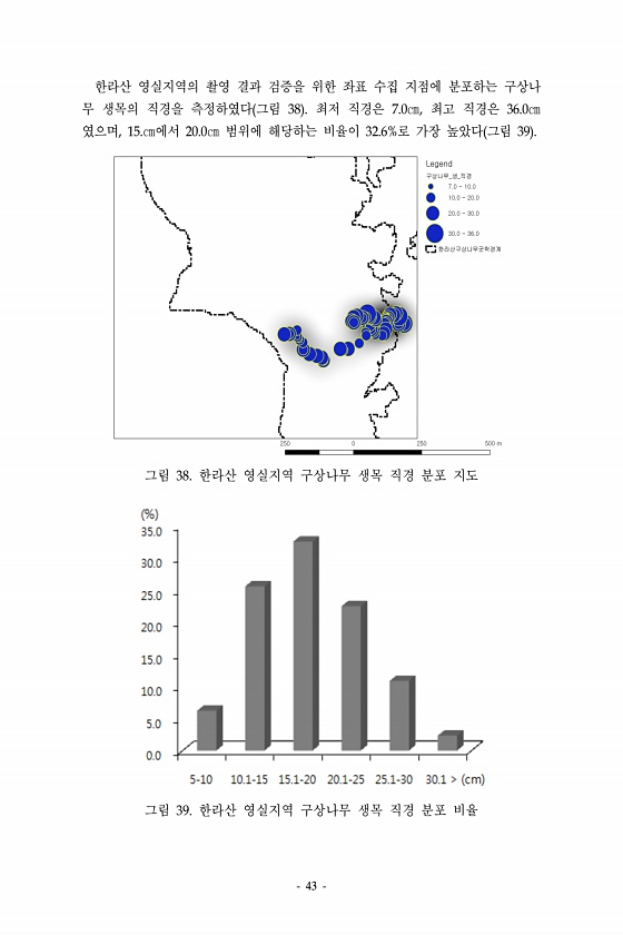 43 한라산 영실지역의 촬영 결과 검증을 위한 좌표 수집 지점에 분포하는 구상나 무 생목의 직경을 측정하였다 그림 38 최저 직경은 7.0㎝, 최고 직경은 36.0㎝ 였으며, 15.㎝에서 20.0㎝ 범위에 해당하는 비율이 32.6%로 가장 높았다 그림 39 그림 38. 한라산 영실지역 구상나무 생목 직경 분포 지도 그림 39. 한라산 영실지역 구상나무 생목 직경 분포비율