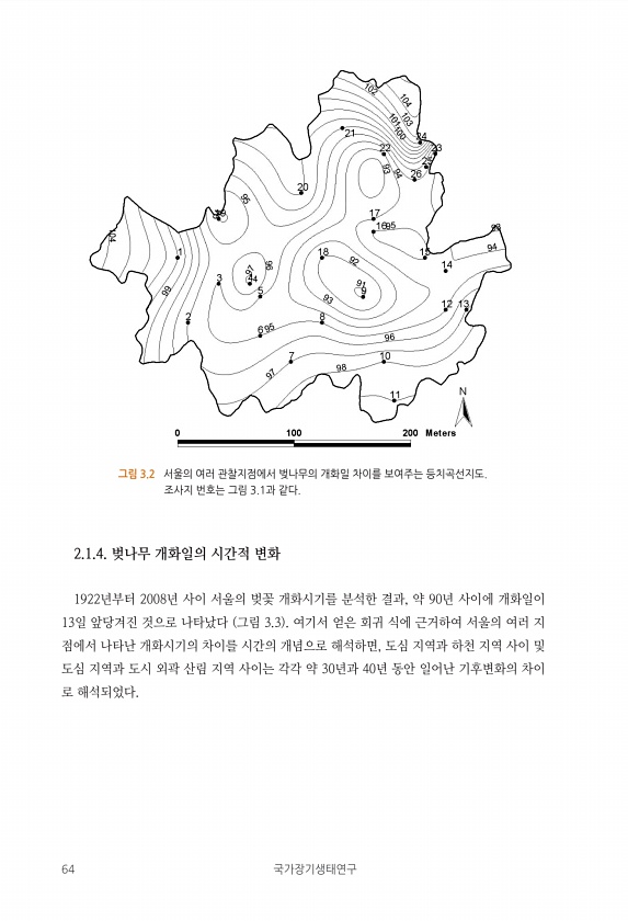 64 국가장기생태연구 그림 3.2 서울의 여러 관찰지점에서 벚나무의 개화일 차이를 보여주는 등치곡선지도. 조사지 번호는 그림 3.1과 같다. 2.1.4. 벚나무 개화일의 시간적 변화 1922년부터 2008년 사이 서울의 벚꽃 개화시기를 분석한 결과, 약 90년 사이에 개화일이 13일 앞당겨진 것으로 나타났다 그림 3.3 여기서 얻은 회귀 식에 근거하여 서울의 여러 지 점에서 나타난 개화시기의 차이를 시간의 개념으로 해석하면, 도심 지역과 하천 지역 사이 및 도심 지역과 도시 외곽 산림 지역 사이는 각각 약 30년과 40년 동안 일어난 기후변화의 차이 로해석되었다.