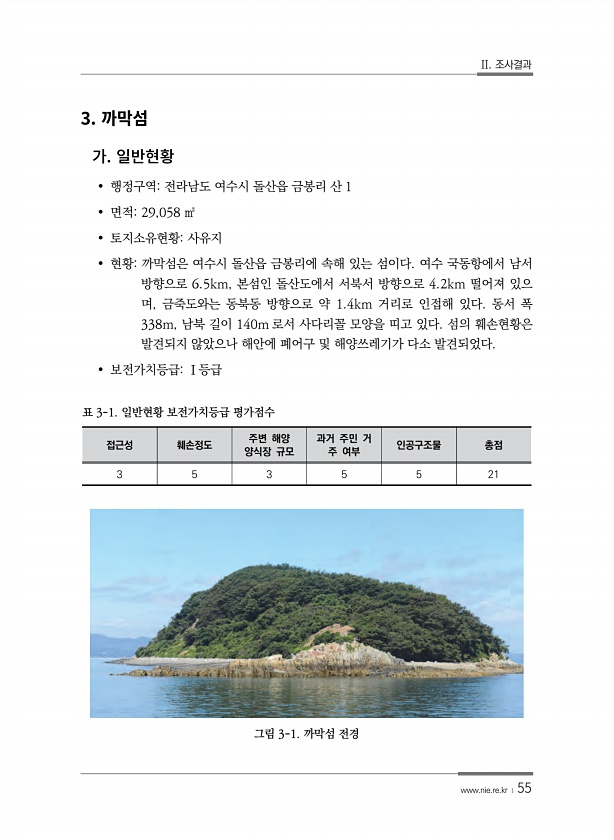 II. 조사결과 www.nie.re.kr ? 55 3. ? 행정구역전라남도 여수시 돌산읍 금봉리 산 1 ? 면적29,058 ㎡ ? 토지소유현황사유지 ? 현황까막섬은 여수시 돌산읍 금봉리에 속해 있는 섬이다. 여수 국동항에서 남서 방향으로 6.5km, 본섬인 돌산도에서 서북서 방향으로 4.2km 떨어져 있으 며, 금죽도와는 동북동 방향으로 약 1.4km 거리로 인접해 있다. 동서 폭 338m, 남북 길이 140m 로서 사다리꼴 모양을 띠고 있다. 섬의 훼손현황은 발견되지 않았으나 해안에 폐어구 및 해양쓰레기가 다소 발견되었다. ? 보전가치등급Ⅰ등급 접근성 훼손정도 주변 해양 양식장 규모 과거 주민 거 주 여부 인공구조물 총점 3 5 3 5 5 21 표 3-1. 일반현황 보전가치등급 평가점수 그림 3-1. 까막...