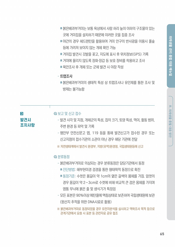 65 외래생물 관리 종합 대응 매뉴얼 Ⅲ. 외래생물 종별 대응 방안 붉은배과부거미는 보통 육상에서 사람 허리 높이 이하의 구조물이 있는 곳에 거미집을 설치하기 때문에 이러한 곳을 집중 조사 야간의 경우 헤드랜턴을 활용하여 거미 안구의 반사광을 이용시 풀숲 등에 가려져 보이지 않는 개체 확인 가능 거미집 발견시 깃발을 꽂고, 지도에 표시 후 위치정보 GPS 기록 거미에 물리지 않도록 장화·장갑 등 보호 장비를 착용하고 조사 육안조사 후 개체 또는 군체 발견 시 야장 작성 트랩조사 붉은배과부거미의 생태적 특성 상 트랩조사나 유인제를 통한 조사 및 방제는 불가능함 ? 보고 및 신고 접수 발견 시각 및 지점, 개체군의 특성, 집의 크기, 토양 특성, 먹이, 활동 범위, 주변 환경 등 파악 및 기록 행안부 안전신문고...