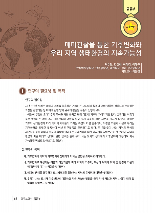 66 탐구보고서 중등부 제5회 국립생태원 생태동아리 탐구대회 탐구결과보고서 Ⅰ 연구의 필요성 및 목적 1. 연구의 필요성 지난 3년간 우리는 매미의 소리를 녹음하여 기록하는 모니터링 활동과 매미 약충이 성충으로 우화하는 과정을 관찰하는 등 매미에 관한 탐사 위주의 활동을 꾸준히 진행해 왔다. 사계절이 뚜렷한 온대기후의 특성을 가진 한국은 점점 아열대 기후에 가까워지고 있다. 그렇다면 여름에 주로 활동하는 매미 역시 기후변화의 영향을 받고 있지 않을까?라는 의문을 가지게 되었다. 매미는 기후와 생태환경에 따라 각각의 개체들이 가지는 특성이 다른 곤충이다. 이같은 의문과 사실로 우리는 지역환경을 최대한 활용하여 이번 탐구활동을 진행하기로 했다. 즉 팀원들이 사는 지역의 특성과 세분화를 통해 매미의 서식과 활동이...